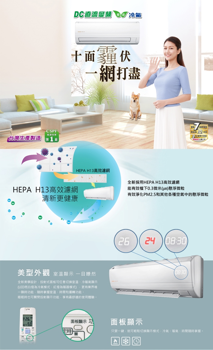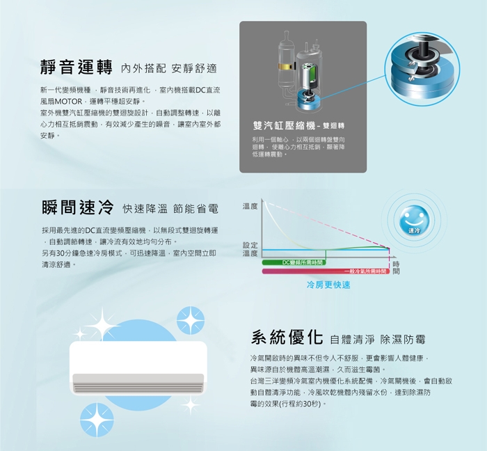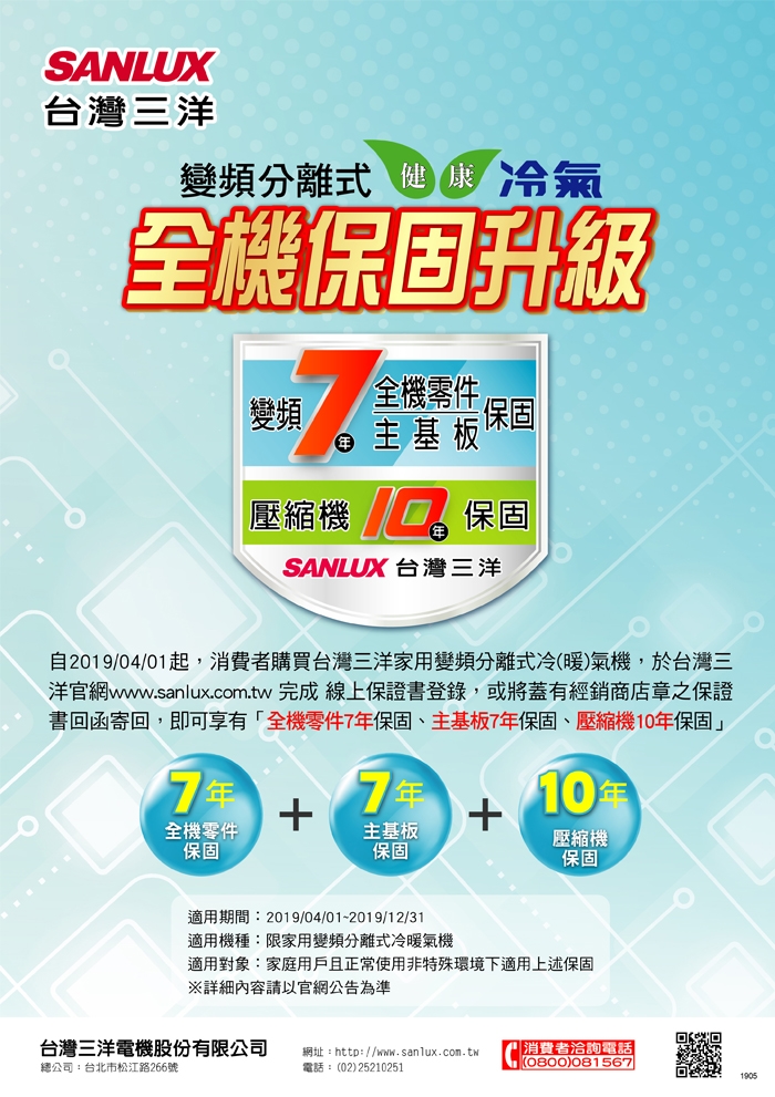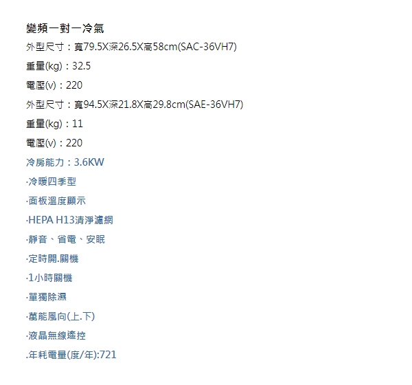基本安裝 舊機回收 能源效率第1級 恕不參與原廠贈品活動 價格更為優惠 商品名稱 台灣三洋SANLUX4 6坪精品變頻冷暖分離式冷氣SAE 36VH7 SAC 36VH7品牌 SANLUX台灣三洋