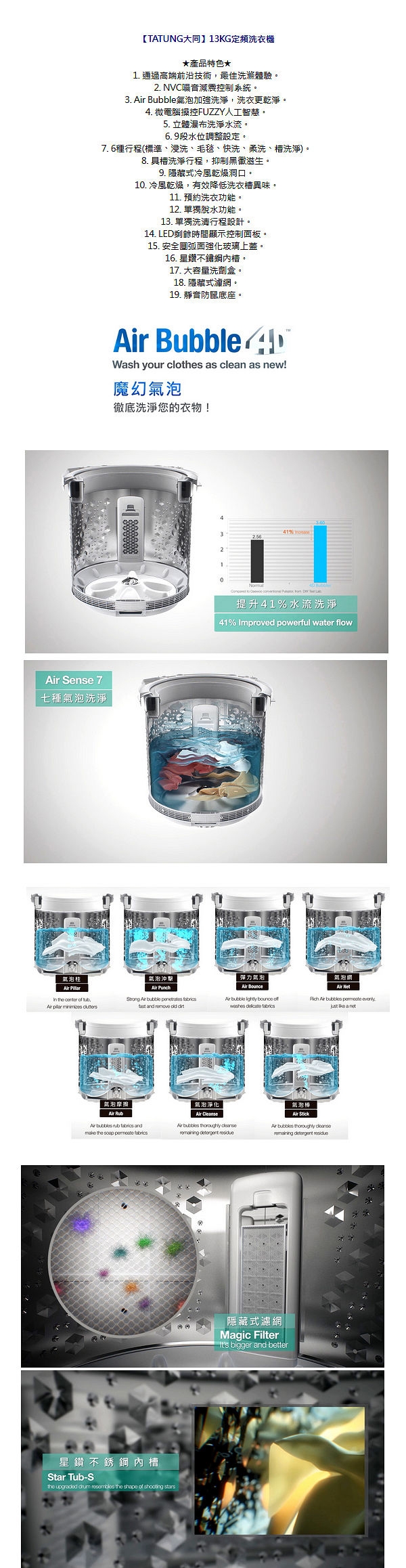 微電腦操控FUZZY人工智慧 立體瀑布洗淨水流 具槽洗淨行程 品牌 TATUNG大同種類 洗衣機型號 TAW A130J顏色 銀色系尺寸 高1030 寬630 深670MM重量 容量 13kg內槽材質