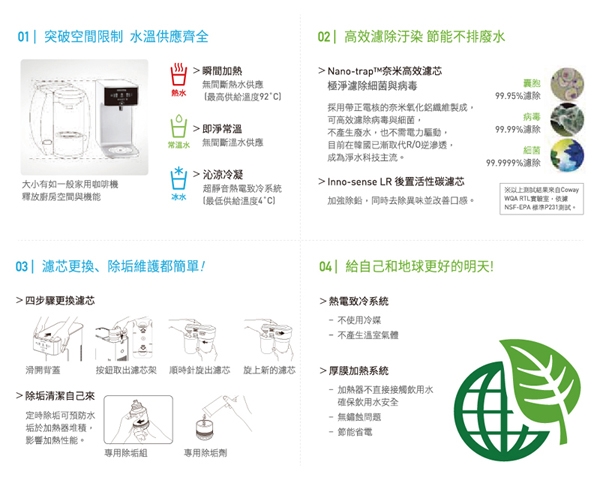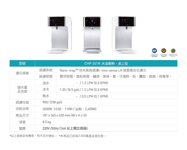 電壓需求為220V 50HZ 16A以上獨立插座 瞬間加熱 不間斷供應溫水熱水 Nano Trap專利高效過濾除菌 商品名稱 Coway濾淨智控飲水機冰溫瞬熱桌上型CHP 241N品牌 Coway種類
