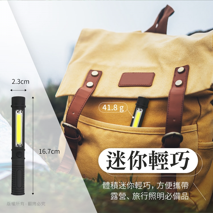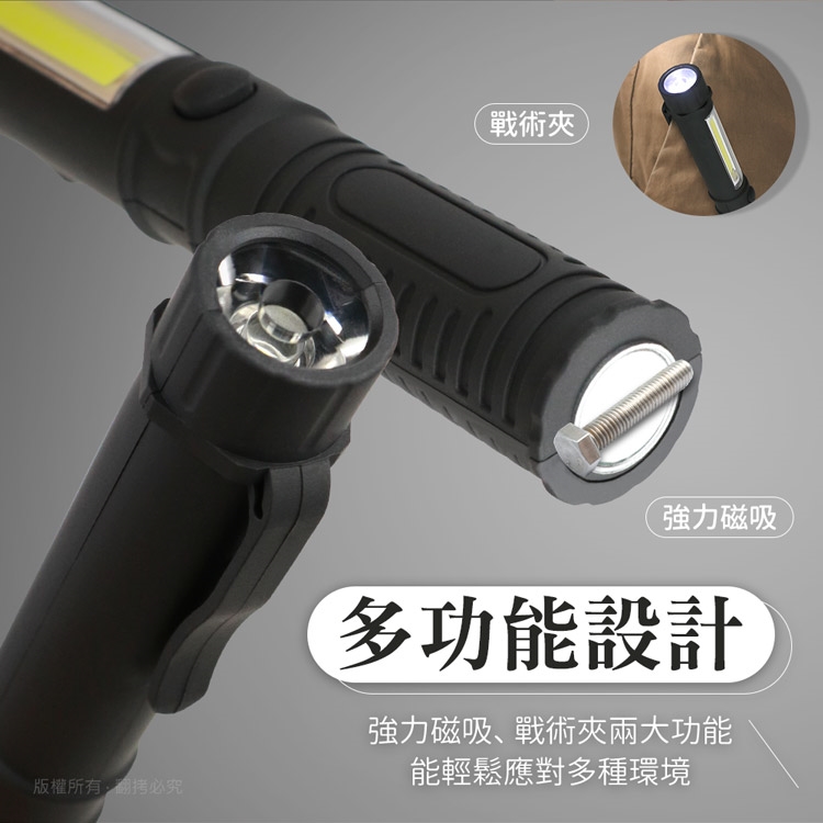 採用COB LED大功率照明 光源均勻 照明更亮 更清晰 前燈 側燈多用途照明 適用各場所 商品名稱 電池式LEDCOB磁吸多功能應急手電筒 LI 31 品牌 aibo型號 USB LI 31類別 隨身