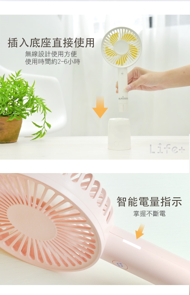 三段式風速調節 隨你切換 插上底座可旋轉擺動 充電 智能電量指示 掌握不斷電 USB充電設計 桌立 手持兩用 商品名稱 LifePlus手持式可擺頭USB充電風扇 桌扇 附旋轉底