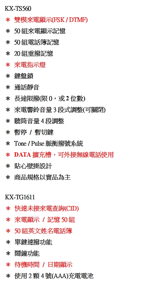 國際牌數位子母機電話 來電顯示功能 貼心可壁掛式設計 商品名稱 Panasonic國際牌數位子母機電話組合KX TS560 KX TG1611 福氣紅 羅蘭紫 品牌 Panasonic國際牌型號 KX TS56