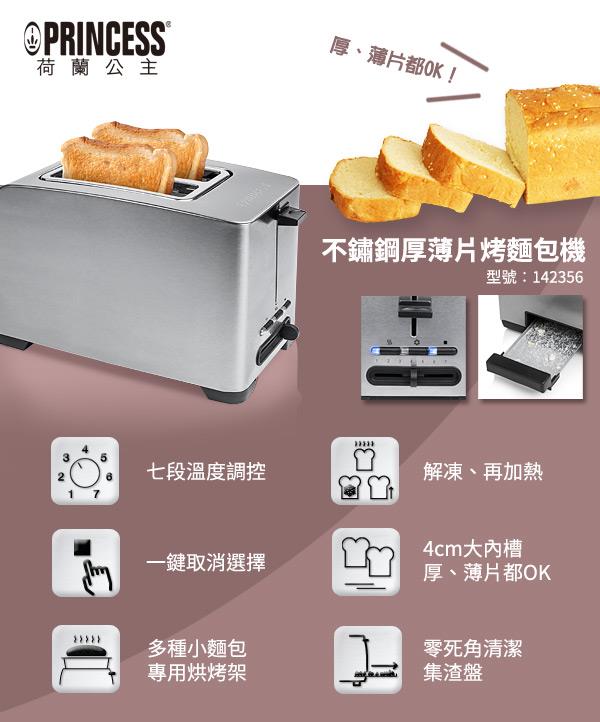 4cm內槽烤厚片 薄片都OK 7種烘烤溫度可選擇 附烘烤架可烤麵包 培果 具再加熱 解凍 一鍵取消等功能 商品名稱 不鏽鋼二片烤吐司機品牌 PRINCESS荷蘭公主型號 142356種類 烤" />