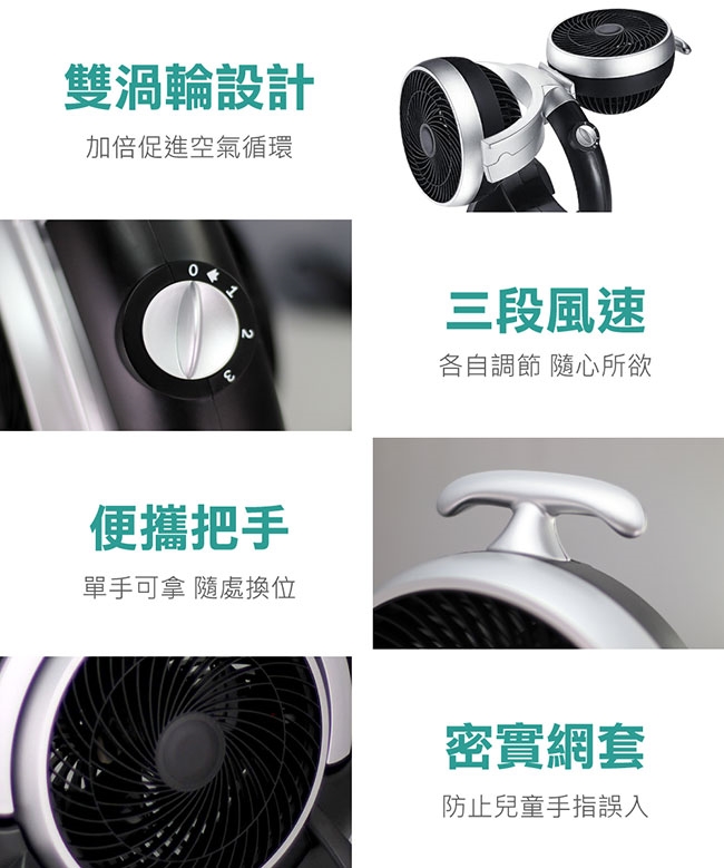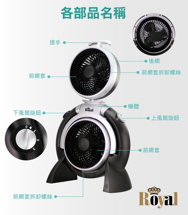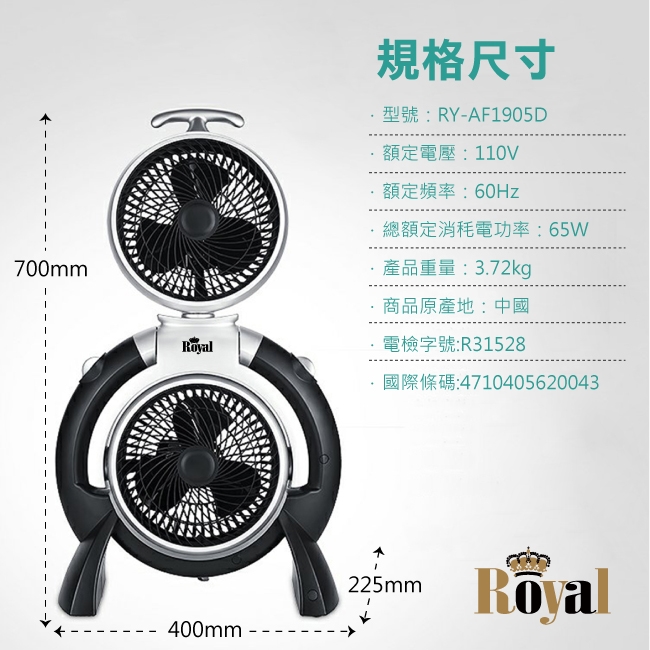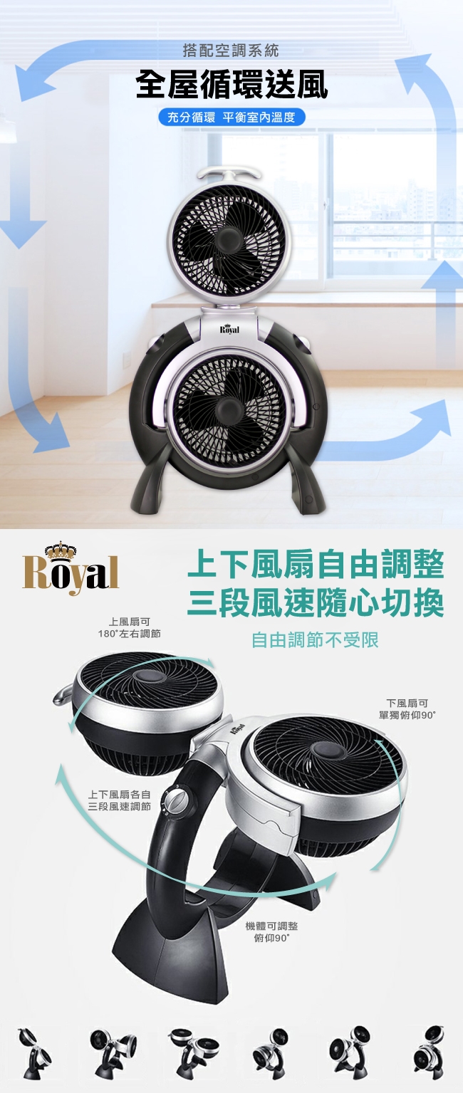 雙頭扇設計 可單獨操作 上下風扇各自 三段風速調節 上風扇可180度左右調節 商品名稱 Royal 雙渦輪空氣循環扇 RY AF1905D 品牌 ROYAL型號 RY AF1905D種類 空氣循環扇風