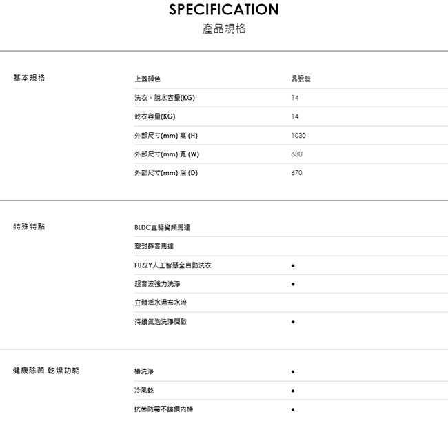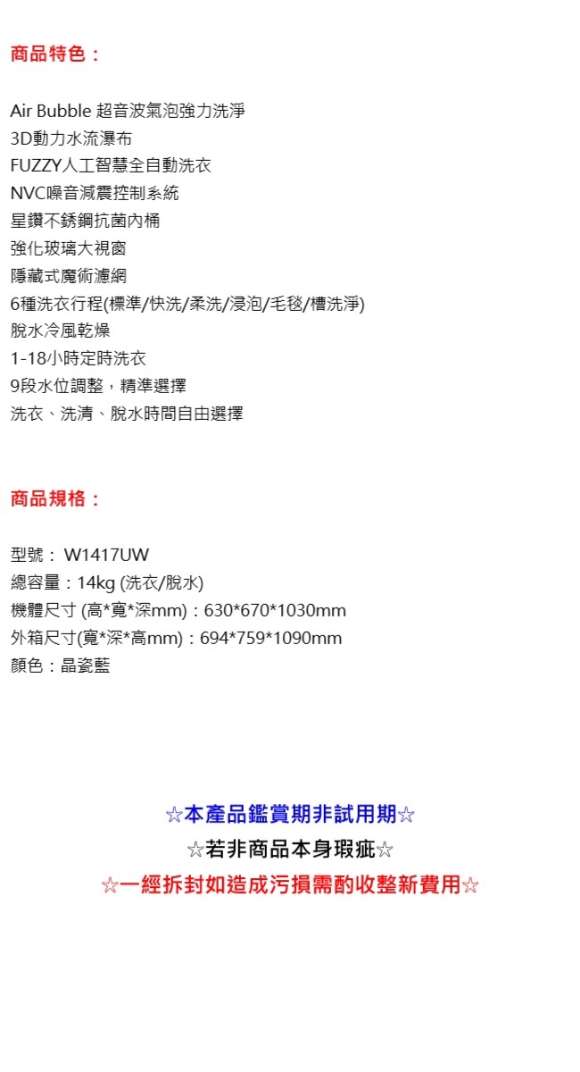 品牌 TECO東元種類 洗衣機型號 W1417UW顏色 藍色系尺寸 機體尺寸 高 寬 深mm 630 670 1030mm外箱尺寸 寬 深 高mm 694 759 1090mm重量 48公斤內槽材質 不銹鋼功能 無容量