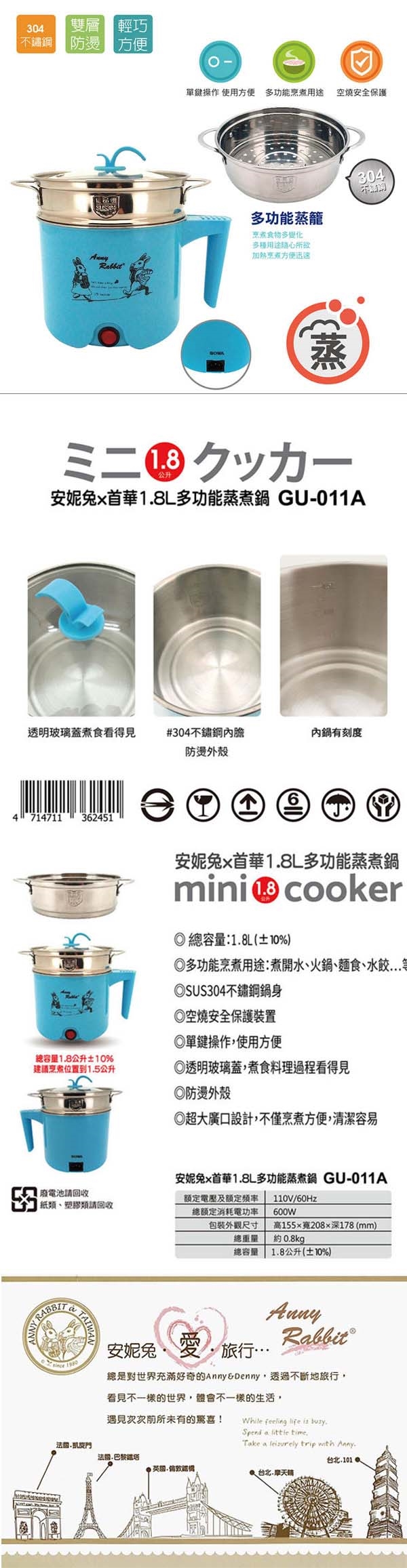 304不鏽鋼內膽 多功能烹煮用途 空燒安全保護裝置 商品名稱 安妮兔X首華1 8L多功能蒸煮鍋018GU 011A品牌 SOWA首華類型 電火鍋 料理鍋 蒸煮鍋型號 018GU 011A內部材質