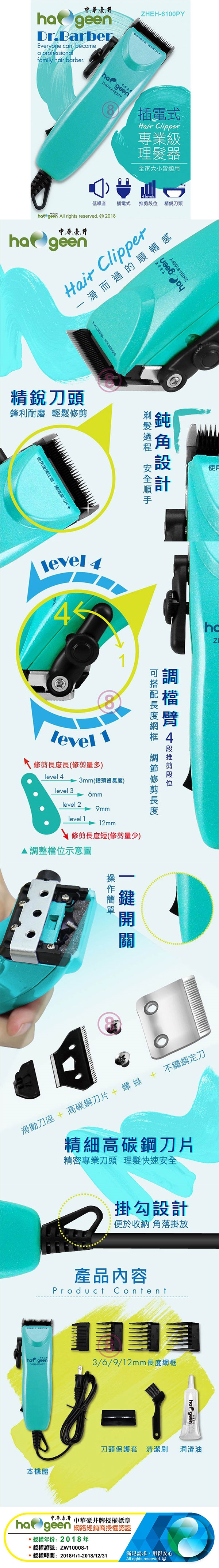 專業靜音馬達 精製碳鋼刀頭 四種推剪長度可以調整 品牌 中華豪井適用對象 成人電源類型 插電式清潔方式 刀頭水洗剪髮長度段數 4段型號 ZHEH 6100PY配件 潤滑油 1 清" />