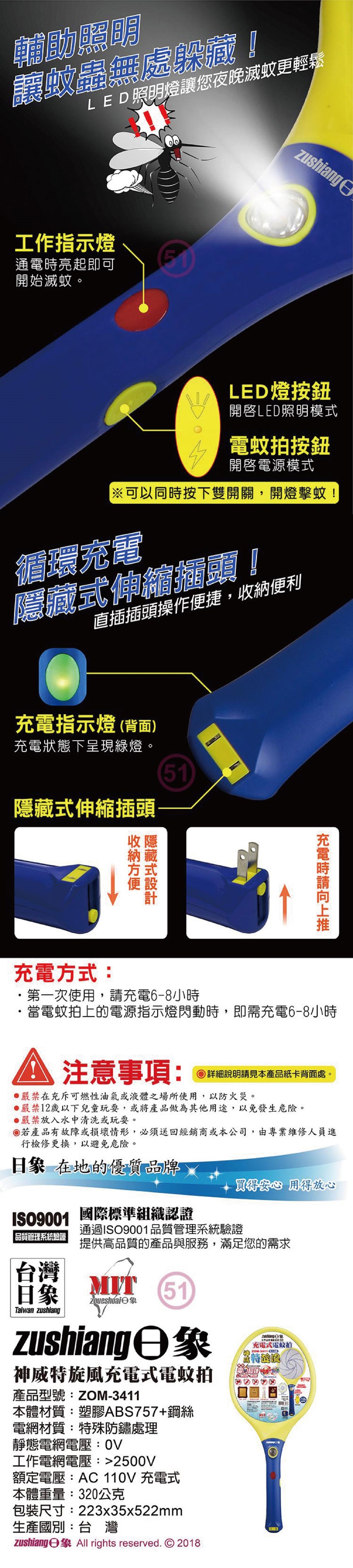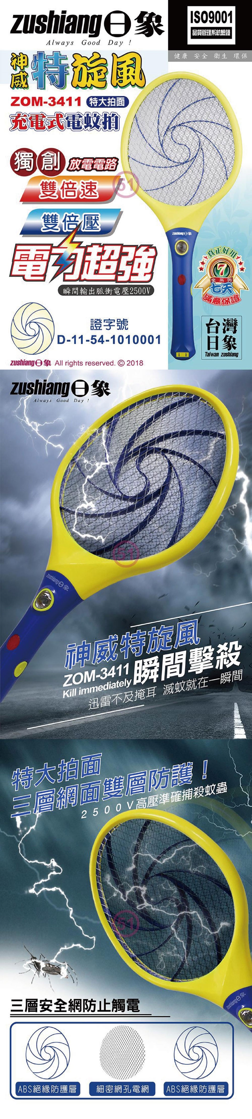 雙倍速 雙倍速雙倍壓放電電路 特亮LED燈 夜間擊蚊更方便 特殊的三層網構成 蚊蠅極易入網 商品名稱 日象神威特旋風充電式電蚊拍ZOM 3411 2入組 品牌 Zushiang日象種類 捕" />