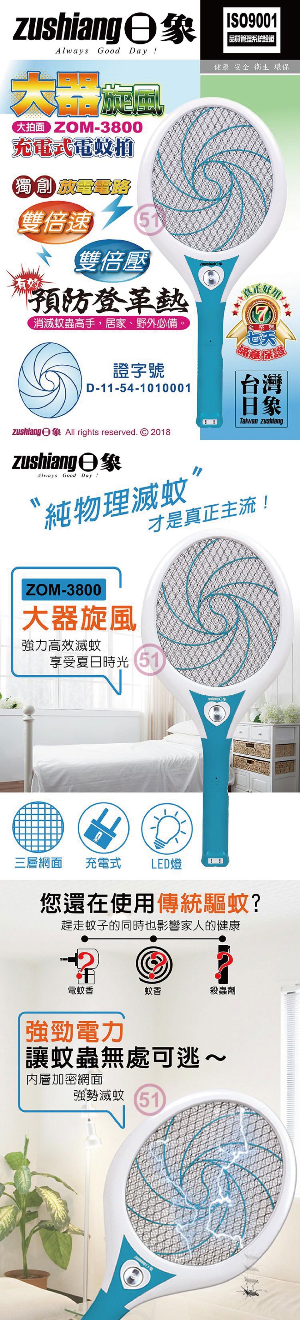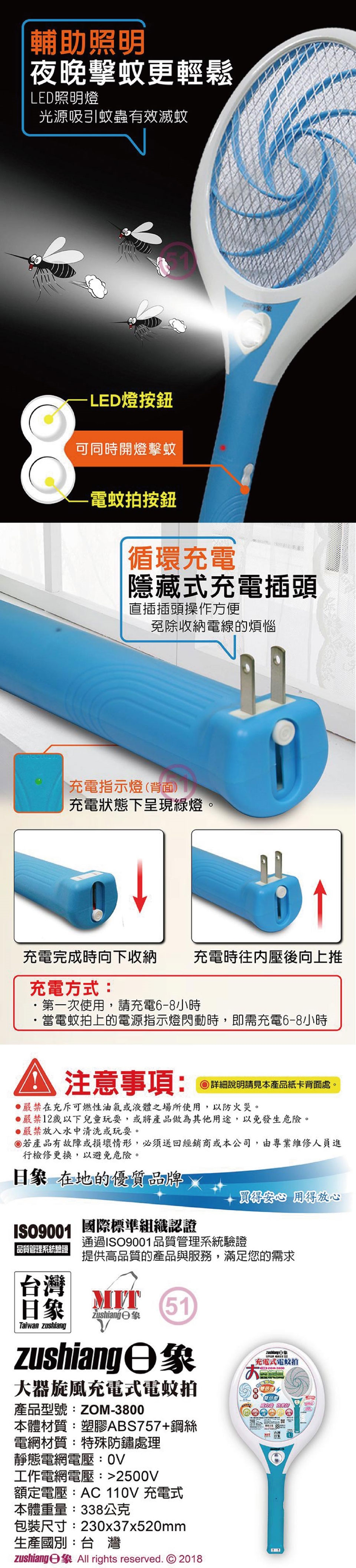 日象大器旋風充電式電蚊拍 ZOM-3800 (2入組)ETMALL東森購物網非買不可 三層網隔面 更安全 不觸電 充電8小時 可連續使用30天 LED全方位照明 商品名稱 日象大器旋風充電式電蚊拍ZOM 3800 2入組 品牌 Zushiang日象種類 捕蚊拍容量 尺寸 型號 ZOM